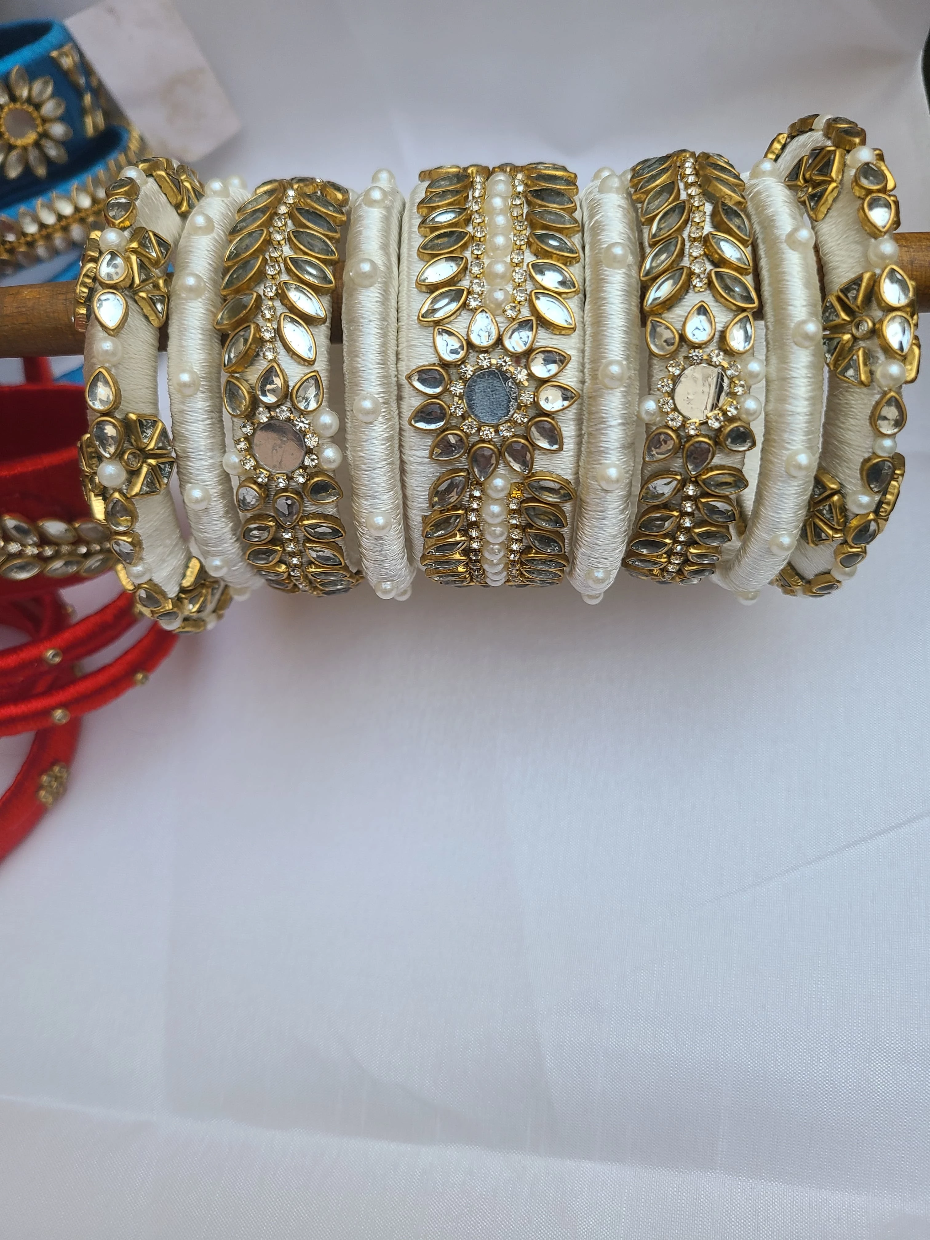White Fancy Silk Thread Kundan Bangles